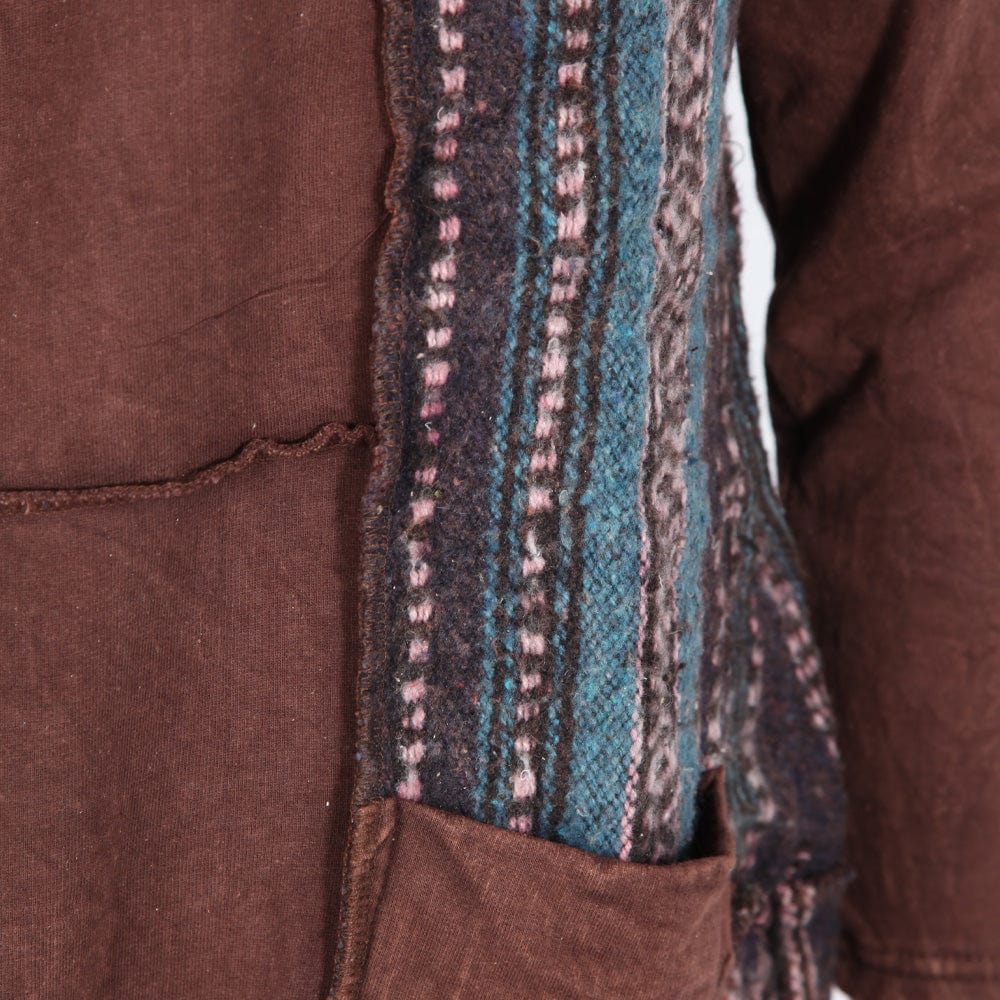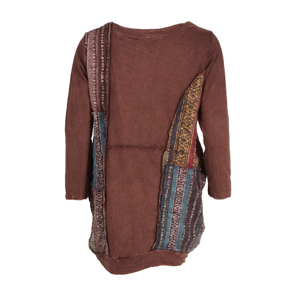 Brushed gheri and patchwork long sleeve brown dress with front pockets. Oversized style.