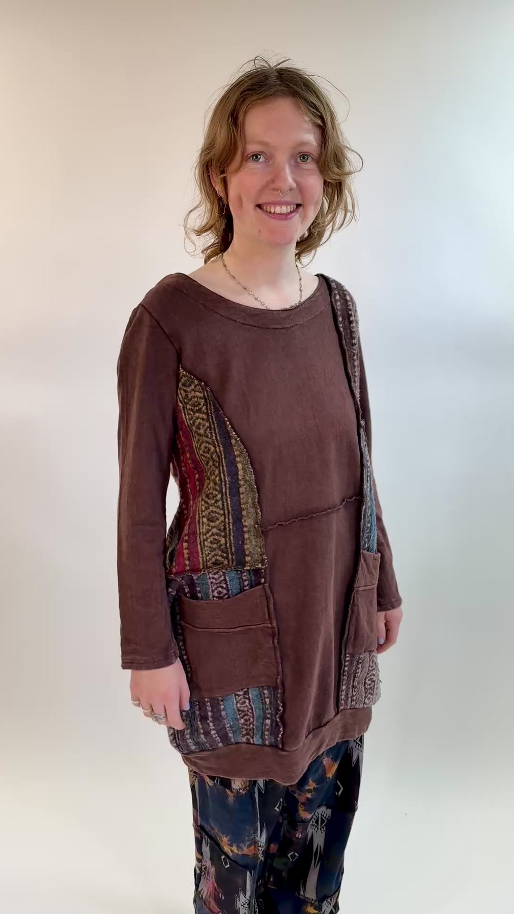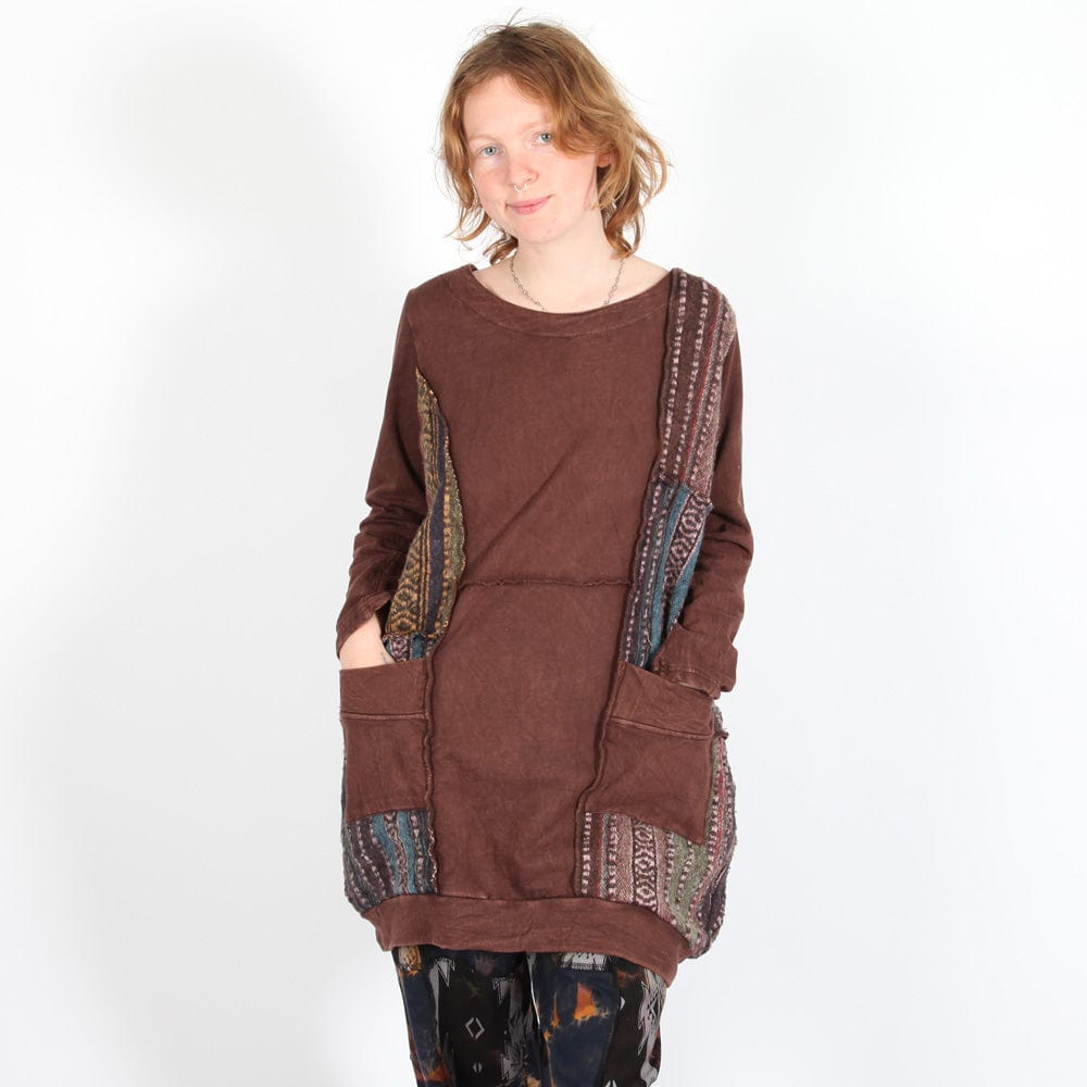 Fall in love with warm, rich brown and keep your look natural. This gorgeous brushed gheri and patchwork long sleeve brown dress with front pockets comes in an oversized style to keep things comfortable and slouchy. The striped gheri material is made on an ancient kind of loom, and the bog, bold patches have raw over-sewn edges for extra interest. A simple rounded neck and straight sleeves allow the material to speak for itself. Wear yours as a tunic or smock if you like, over a skirt or trousers from our wonderful collection.
