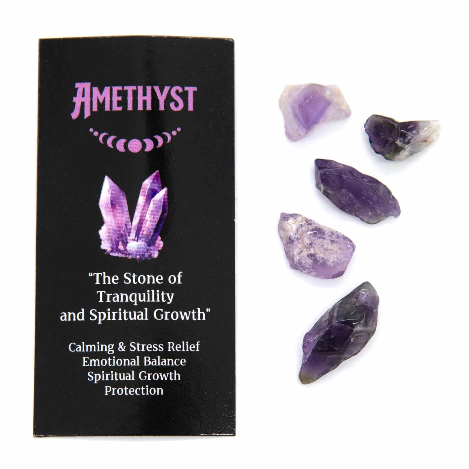 Amethyst incense includes an information card about the crystal and a small set of mini amethyst crystals.