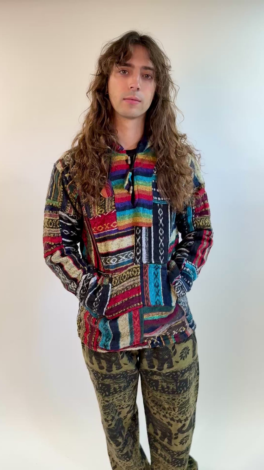 Did we hear you say 'wow'? Probably! The colours and patterns in this dramatic brushed Gheri cotton fleece-lined pullover hoodie make it one of the most stand-out hoodies we've seen for a while. Gheri cotton is amazing stuff, warm and bright with a complex weave in all sorts of vibrant colours, patched together creatively to make this warm, cosy men's hoodie top. The fleece lining makes it even warmer. Wear yours with your joggers or trackie bottoms, jeans, cargo pants, or even a pair of our outstandingly colourful harem trousers.