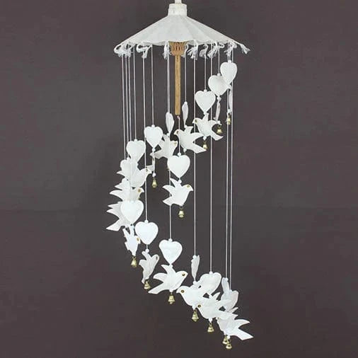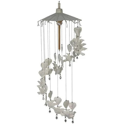 Beautiful! Symbolise peace and love in your home with this deliciously pretty Peace Dove Saa Paper Mobile, perfect to hang in the hallway, a room, in front of a window, wherever you like. The creamy, delicate little doves form a long, elegant spiral shape, each held by thread embellished with tiny golden bells. As their air moves, they gently tinkle. It's finished off with a beautiful parasol in cream with little tassels. A delightful way to bring harmony to your hippy home, in a colour that always looks good whatever your decor.