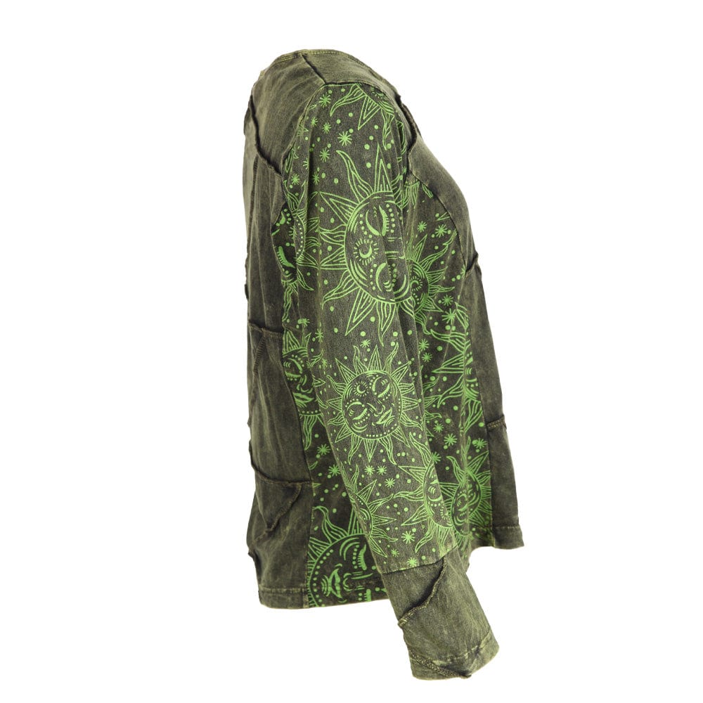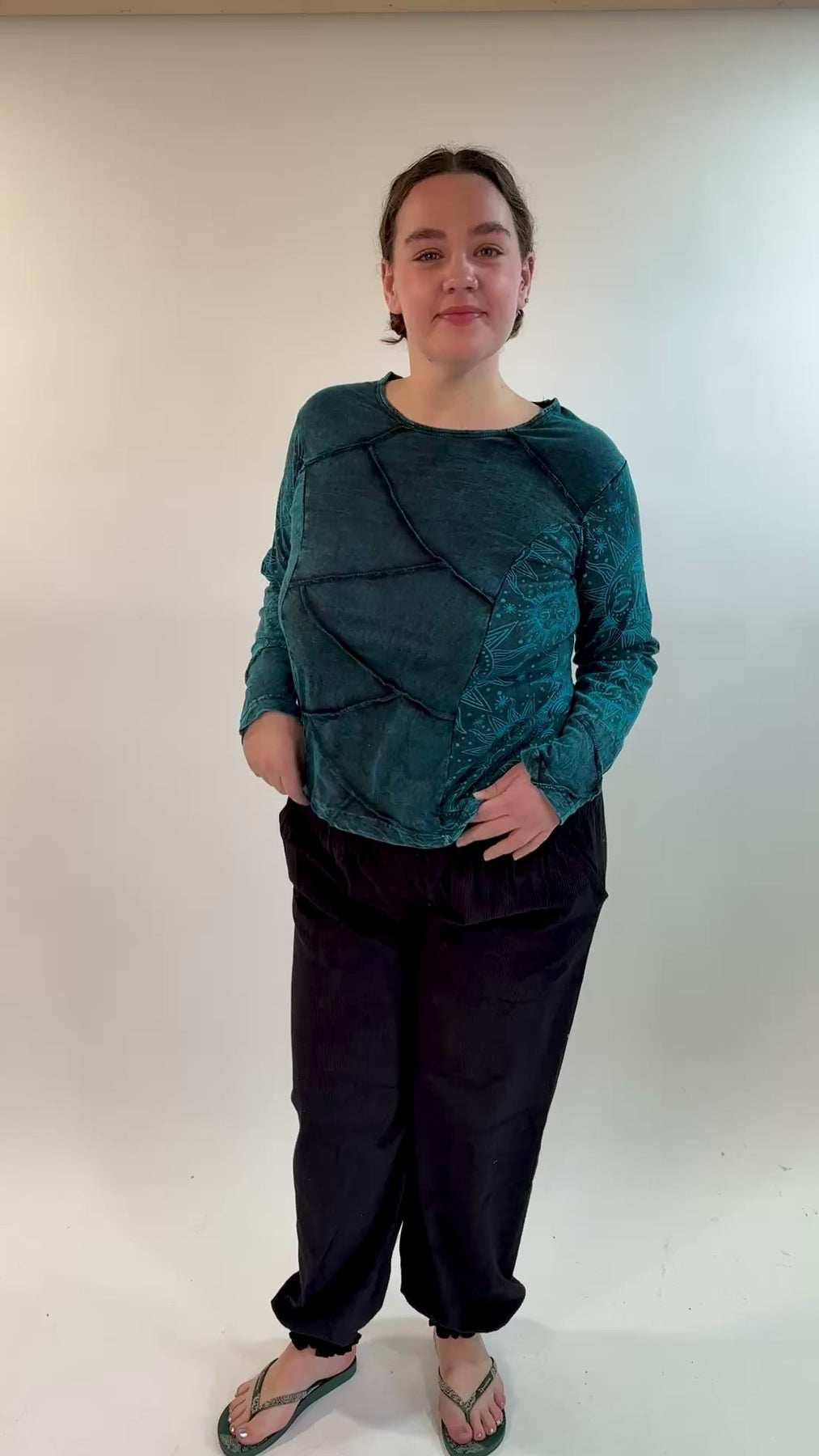 So you're looking for a long sleeve T? Try this, a stonewash casual long sleeve T-shirt with a difference! Available in leafy green or rich ocean blue, this clever little top comes with all sorts of interesting details. The plain panel down the front and back features funky raw edges, with the patches arranged diagonally. The sides and sleeves are screen printed with lush suns and tiny stars in a toning colour. A neat rounded neck and plain cuffs complete the picture, and it's slightly fitted for an elegant outline. We even have a gorgeous pair of sun print harem trousers to match.