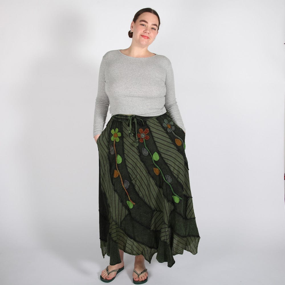 Flow your way through life in this fantastic overdyed embroidered hanky hem skirt, a little masterpiece of fine details. Patches of pretty cloud-grey fabric have been carefully stitched together in a diagonal pattern to give you a lovely, frothy swing at the hem. The striped material looks a lot like the veins in a leaf, and the pretty flower and leaf applique finishes the natural theme perfectly. It goes great with a hippy top from our large collection, and it's wearable every season. Just add boots and a chunky knit for an extra-funky winter look.