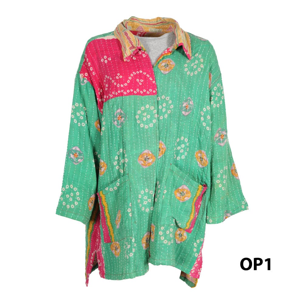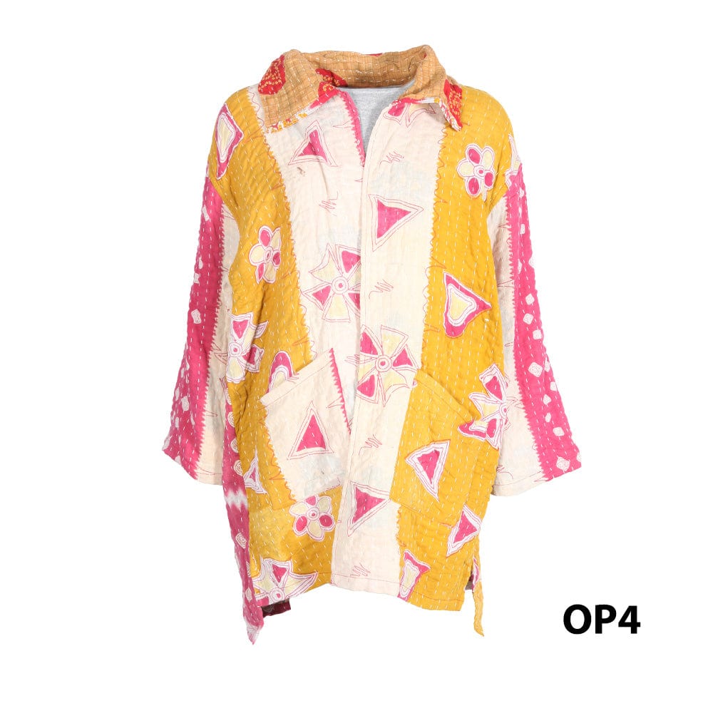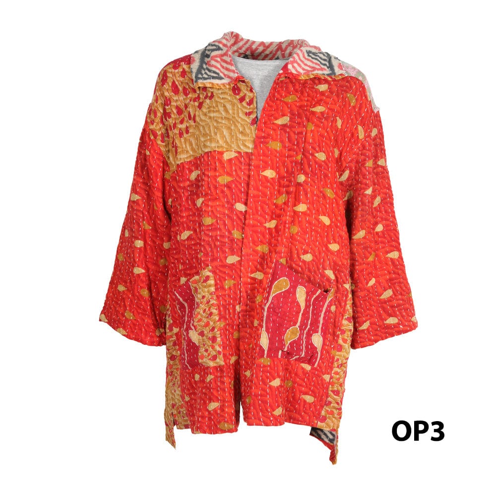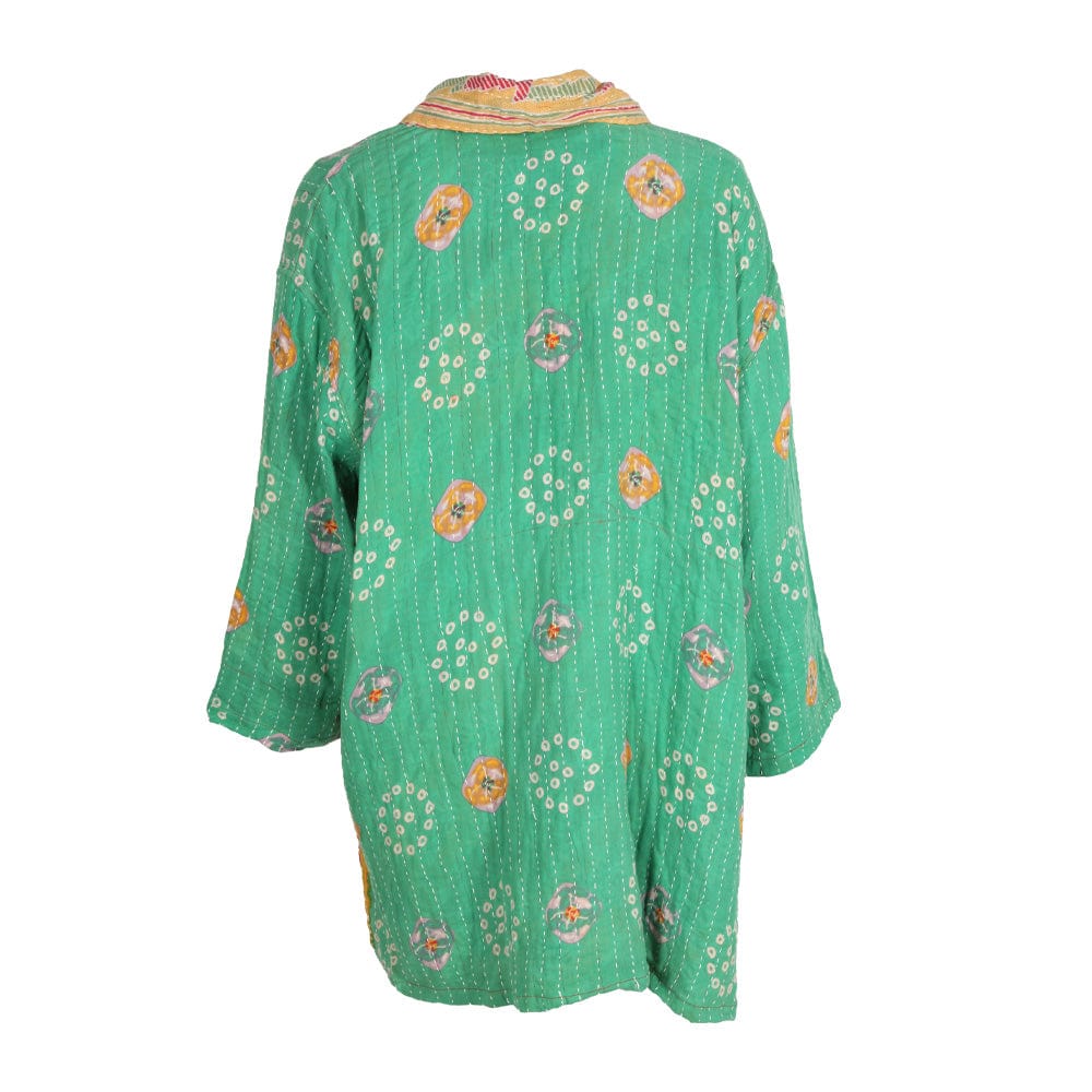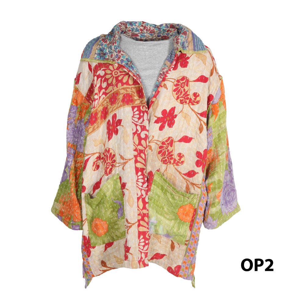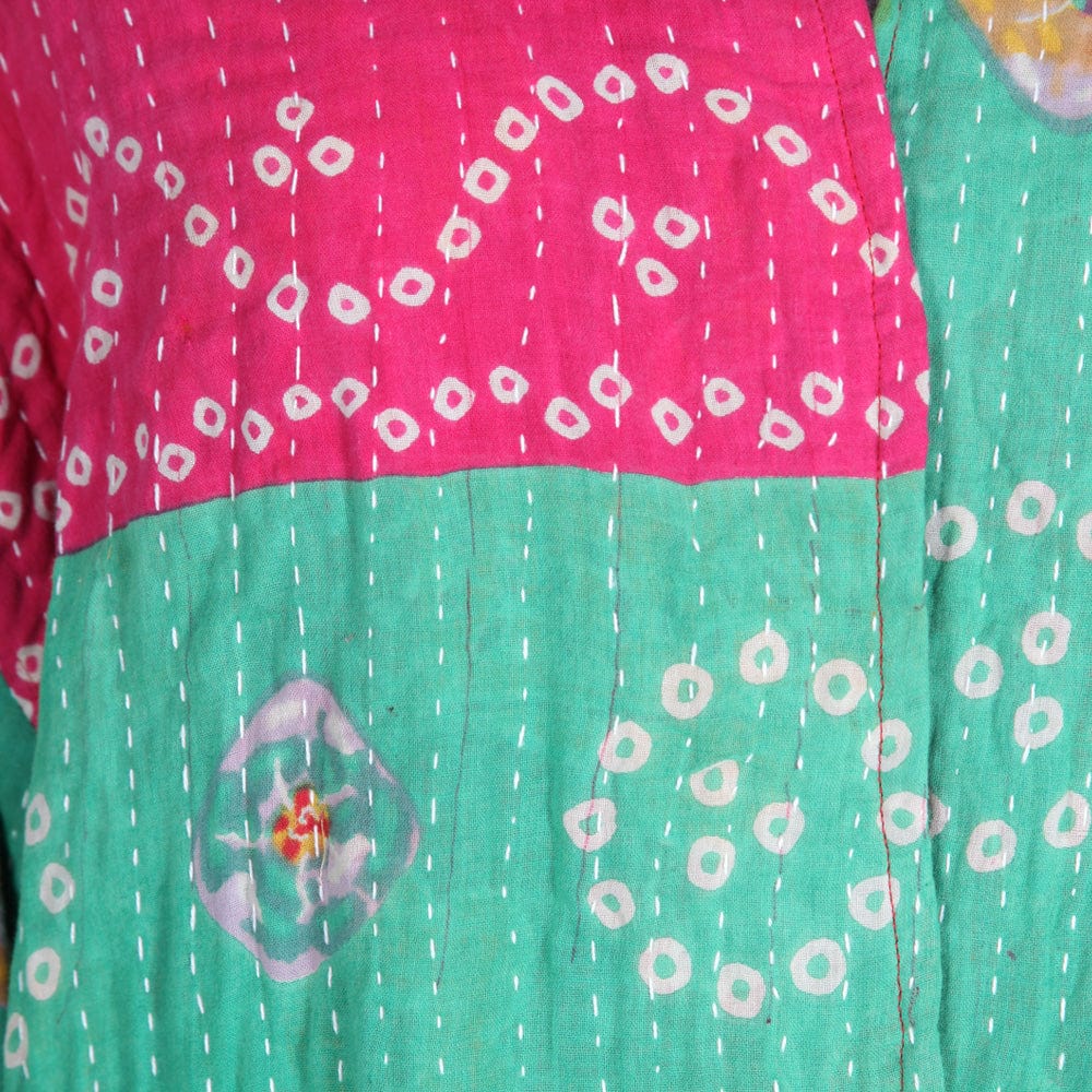 Kantha reversible mid length jacket with funky colourful patterns. Big pockets on inside and outside, so can be worn either way round. Each jacket is completely unique.