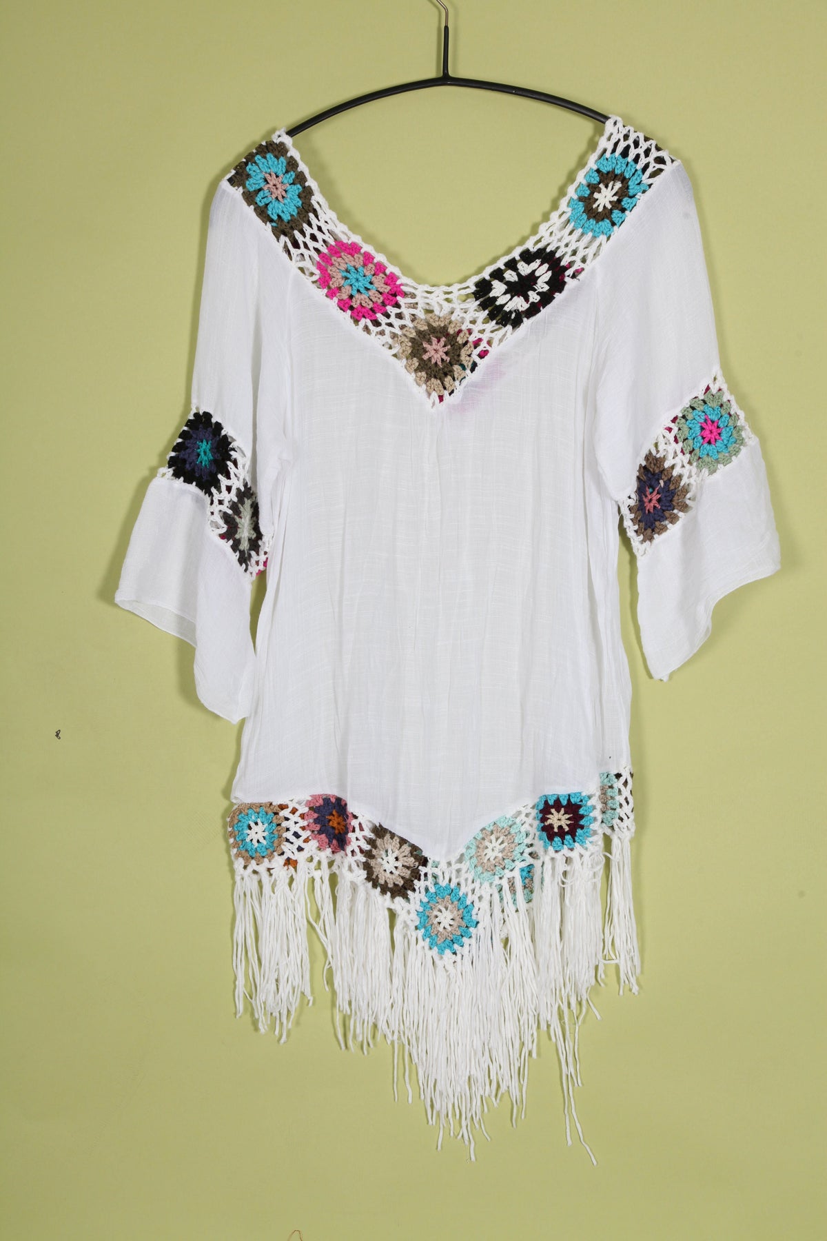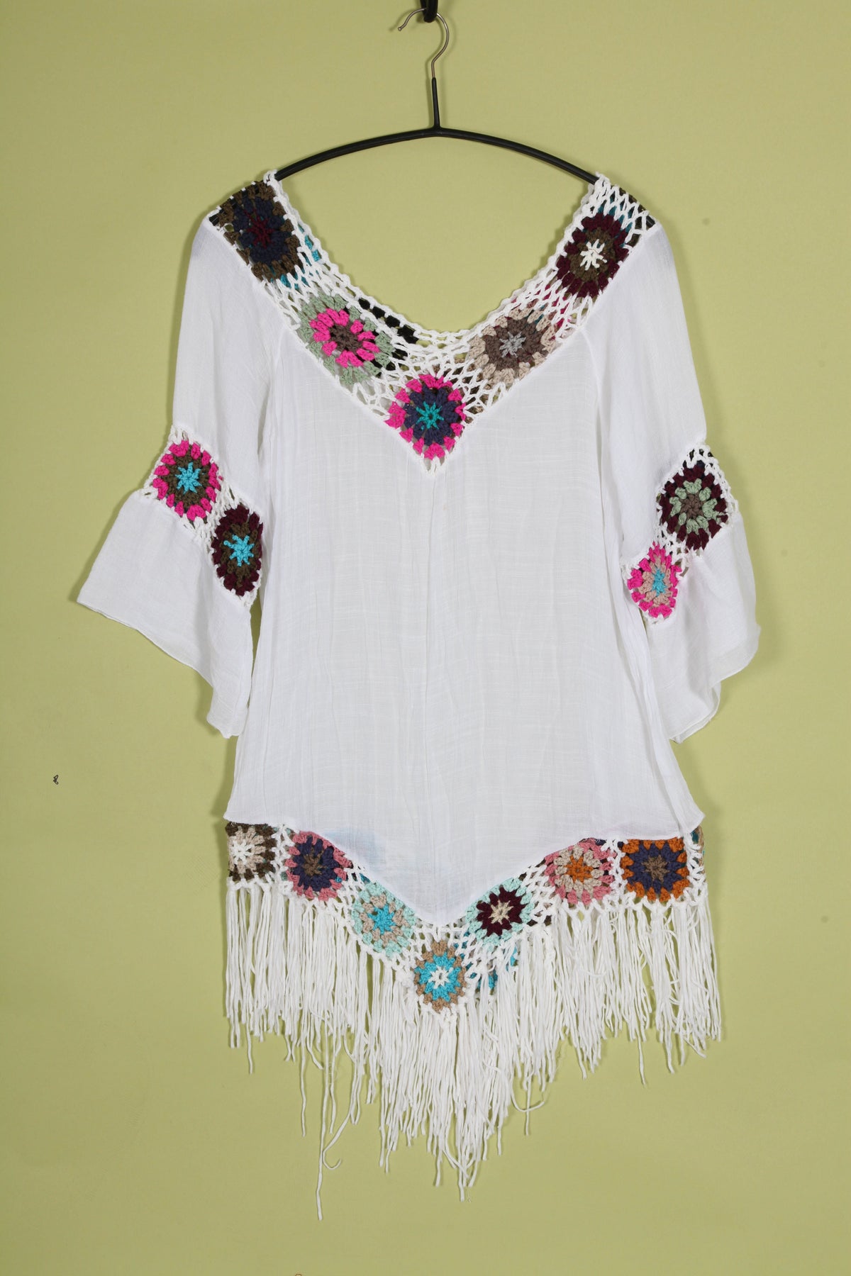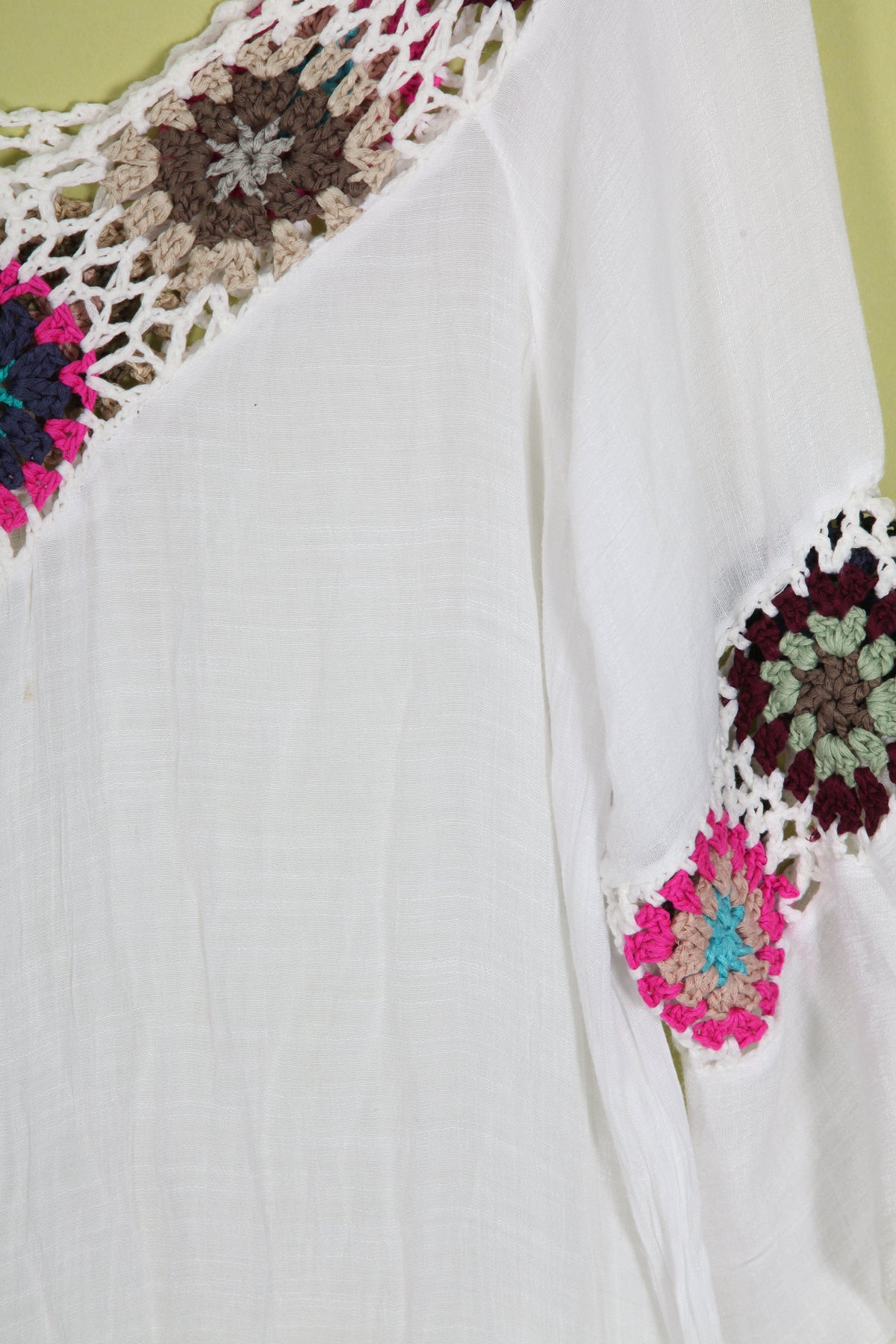 Vintage boho white cover up top with funky colourful crochet squares and mid length sleeves.