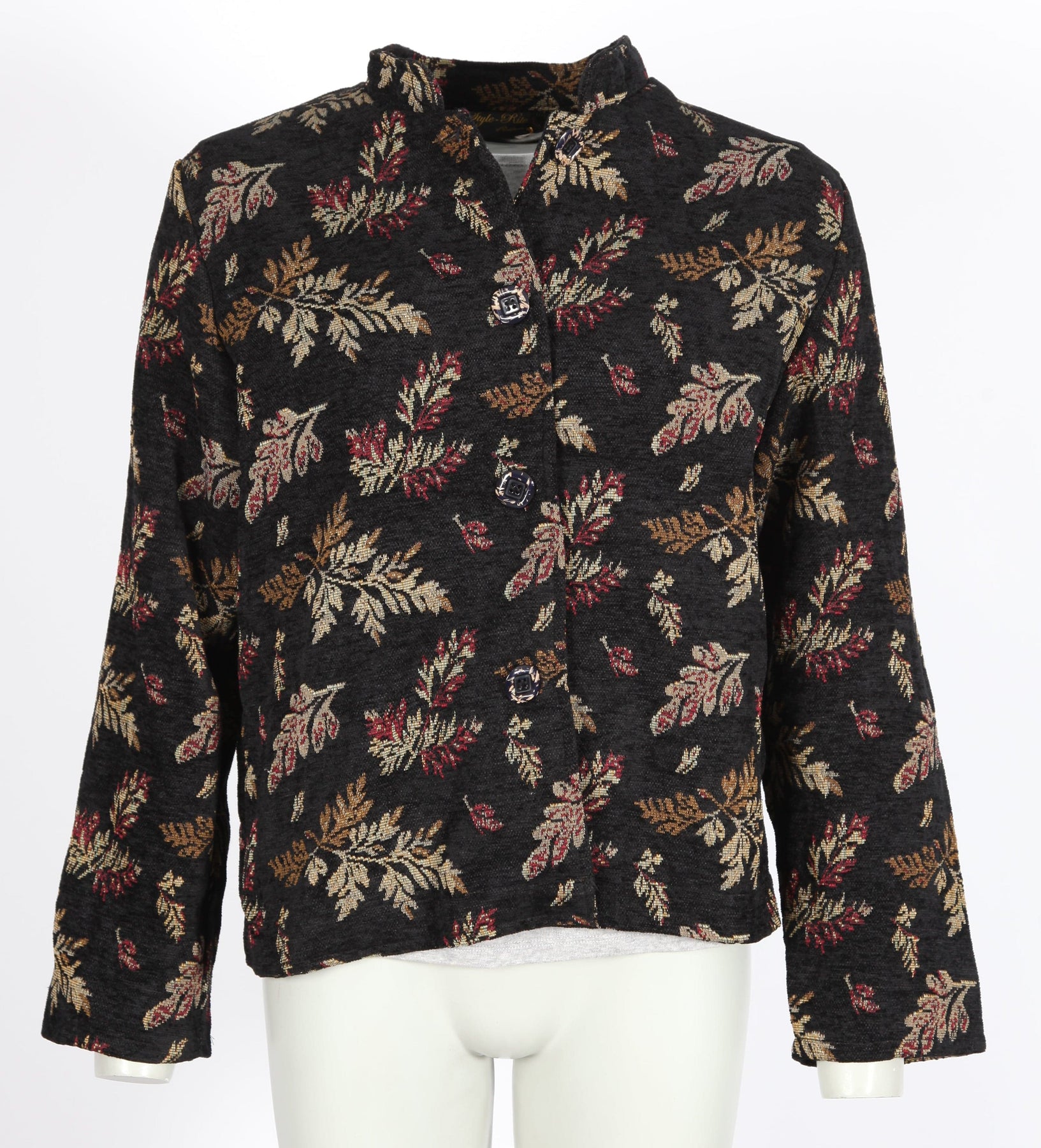Vintage boho black floral tapestry button up jacket.