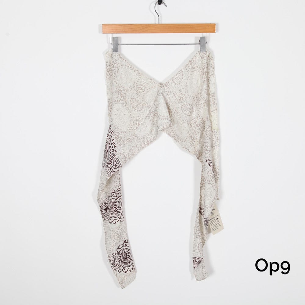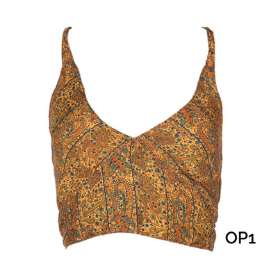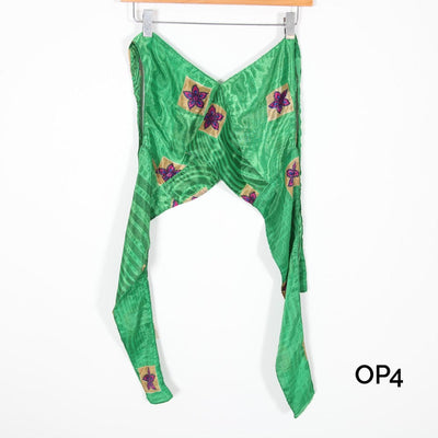 This is exactly what you need for long, hot, lovely summer! Our pretty upcycled sari bralette tie-back top is a thoughtful choice, re-using beautiful fabrics that'd otherwise be wasted. It also means each one is unique, so check out the option numbers and corresponding pictures below. It's an easy wear, perfect for festivals and late night partying, days on the beach, holidays and chilling in the sun. Just add harem pants, a hippy skirt or your favourite jeans.